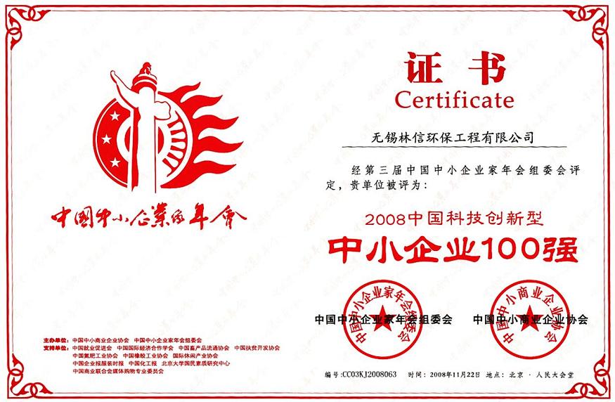 中國科技創(chuàng)新型中小企業(yè)100強(qiáng)證書